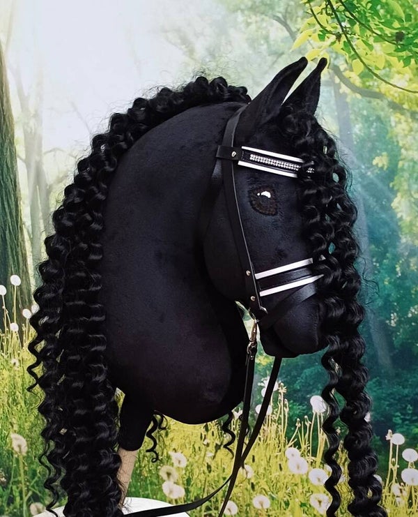 Deze hobbyhorse is niet zomaar een stokpaardje, maar een realistisch ontworpen hobbyhorse met een zwarte vacht met bijpassende rastypische lange krullende manen en voorpluk, perfect voor elke hobbyhorse-liefhebber.