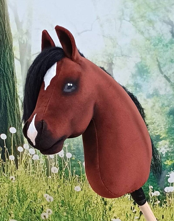 Kastanjebruin/roodbruin met zwarte manen, kolletje en sneb.Wordt geleverd inclusief bevestigde stok.